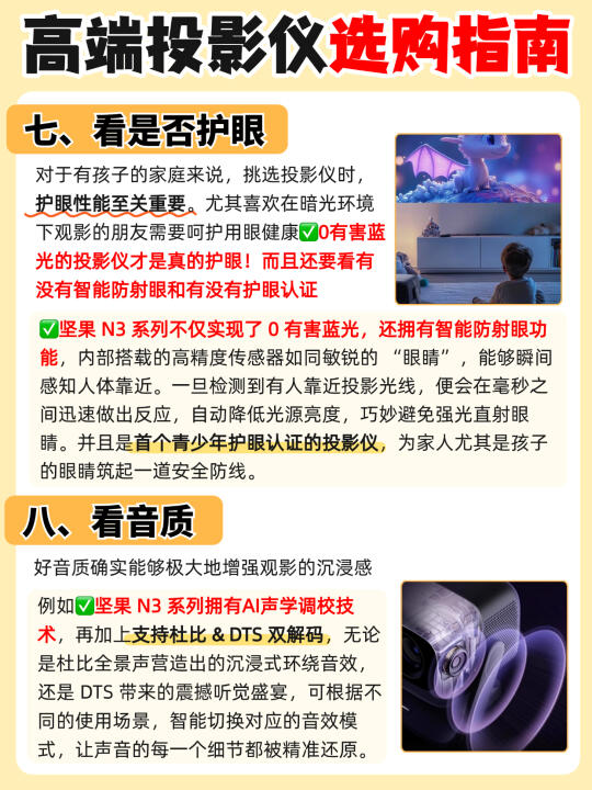 支持0有害蓝光的投影仪才是真的护眼!坚果 N3 系列不仅实现了 0 有害蓝光,还拥有智能防射眼功能,并且是首个青少年护眼认证的投影仪,有孩家庭放心选!