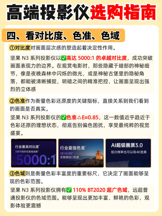 色准、色域:坚果 N3 系列投影仪高达 5000:1 的卓越对比度,更有层次感!色准△E≈0.85,色彩更还原;110% BT2020,色彩更鲜艳!