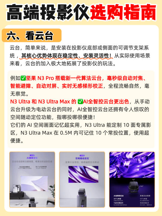 N3 Pro新一代算法云台功能多,可上下160°水平360°,超大角度调节,N3 Ultra 和N3 Ultra Max的AI全智控云台更出色;定位、记投影位置,遥控转动体验佳,解放双手。