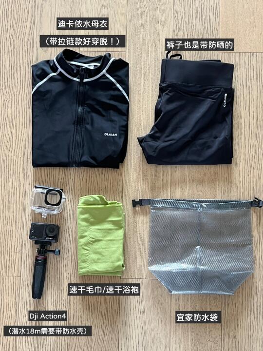 另外,珊瑚友好防晒、防晒帽、防水袋、水下拍摄设备(潜水店会帮你拍一些,但要在你已经掌握下水技巧后,潜水教练才会帮你拍,其他时间上课为重)
