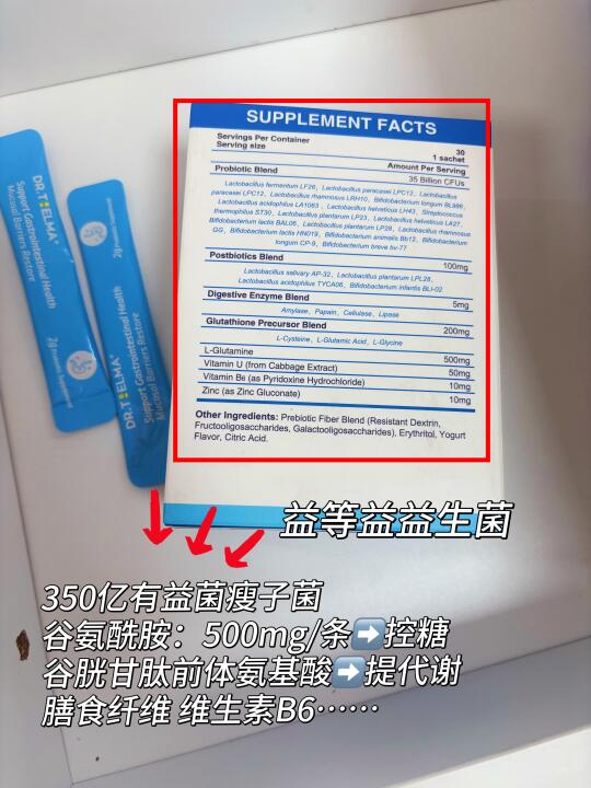 除了有益菌足量之外,还看中里面的谷氨酰胺可以控糖……小基数可能无法理解,我这种大基数真的吃一点就飚糖,身体血糖一高马上长肉。。