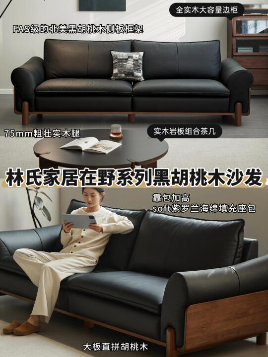 ✔️整体看上去就显贵气有质感,FAS级的北美黑胡桃木侧板框架,色泽复古高雅,搭配黑色天然的头层皮革,整个就自带高级的中古氛围 手工匠心的大板连纹直拼工艺,打磨出堪称精品的黑胡桃木沙发,呈现出独具艺术美感的纹理色泽