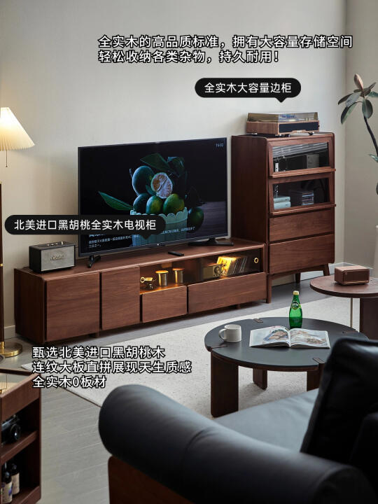 边柜同样秉持北美进口黑全实木的高品质标准,拥有大容量存储空间,轻松收纳各类杂物。