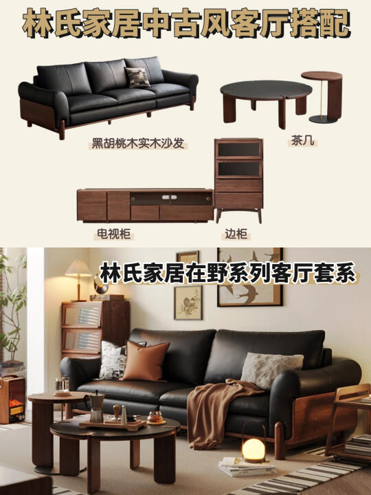 除了沙发,橙子还给大家做了中古风客厅搭配👉🏻林氏家居在野系列,统一的黑胡桃木材质与颜色, 更能凸显中古风设计设计氛围感~