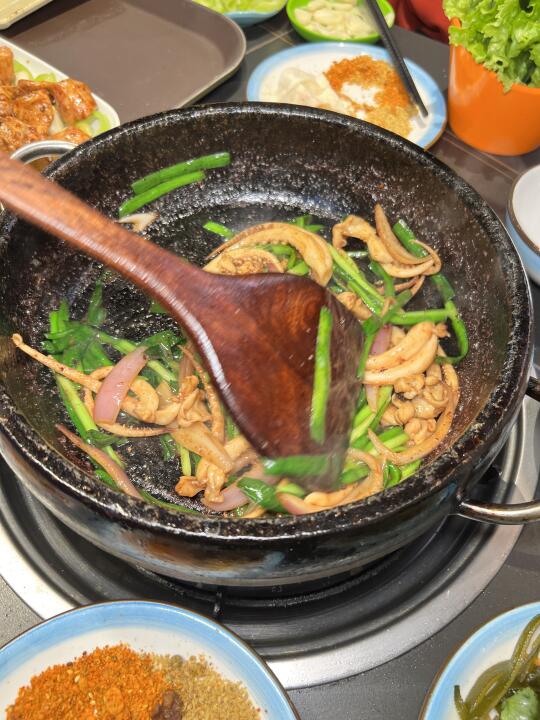 看胡光果吃的超级香,直接种草! 今天吃到我的嘴巴里!果然!好好吃! 姐妹们快冲!在财大附近 叫天桥石锅烤肉 牛上脑洋葱🧅绝! 鱿鱼须韭菜绝! 鸡脆骨、肥肠绝! 最后的石锅面绝绝绝! 可以卷饼吃、也可以煮面~ 总之就是爱上啦!