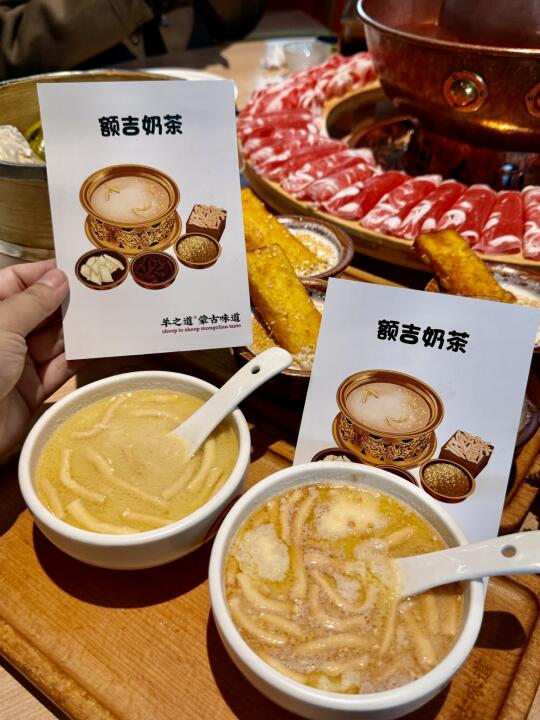 谁懂!!不用去内蒙!在广州就能喝上超正的内蒙古奶茶—额吉奶茶!!咸口的好好喝🥹 还有嚼口炒米绝了!!三色特色烧麦也贼好吃😭铜锅涮肉!羊肉嫩滑!吃得太爽了啊啊啊啊