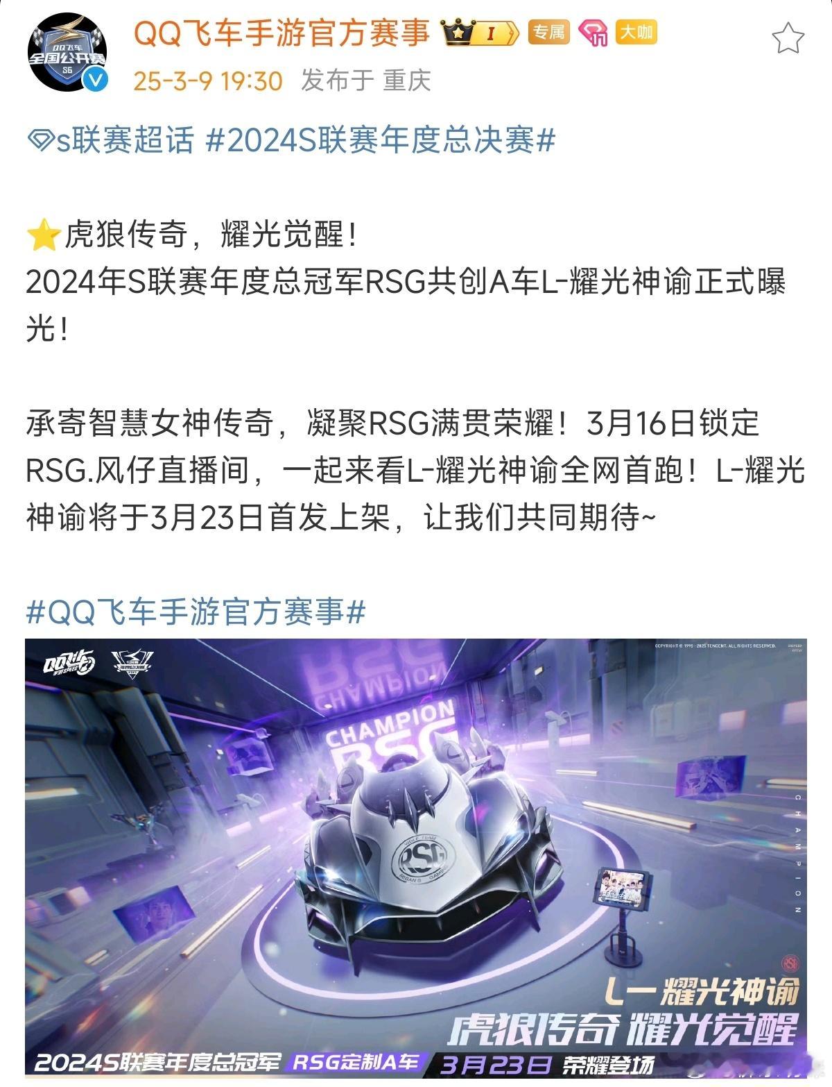 RSG共创A车L-耀光神谕曝光!以智慧女神为原型进行升级!3月16日风仔全网首跑!3月23日首发上架!qq飞车手游[超话]QQ飞车手游心机牌2024S联赛年度总决赛qq飞车手游