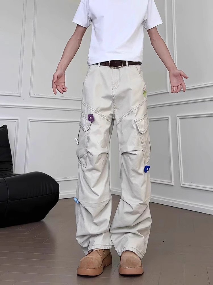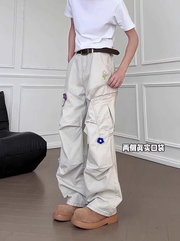 刺绣多口袋工装裤男款高腰痞帅炸街弯刀裤子