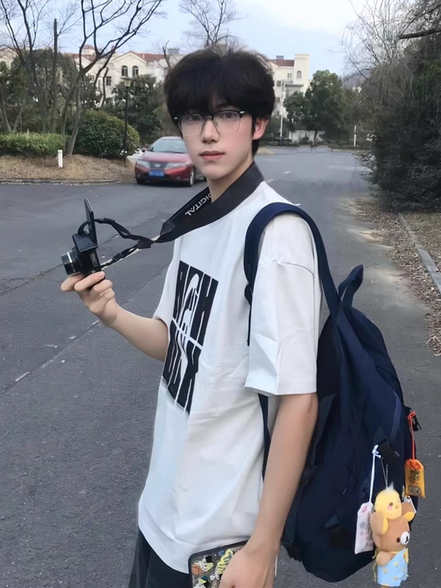 浅蓝色魔术贴刺绣T恤男cleanfit夏