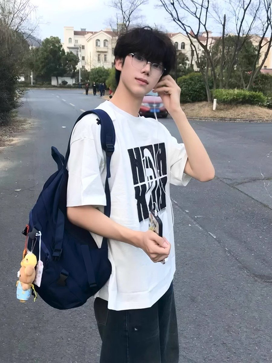 撞色字母灰色t恤男夏季美式复古凉速干正肩