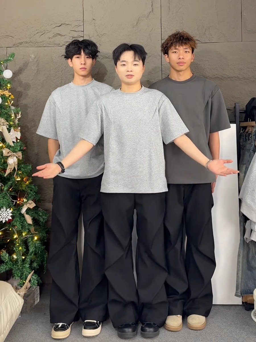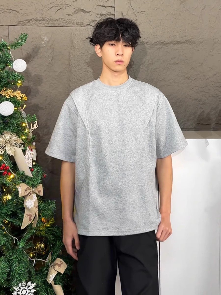 浅灰色解构拼接短袖男款夏季小领口正肩t恤