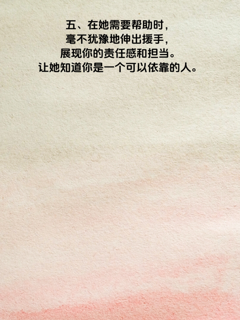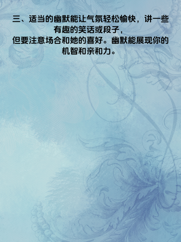 一、保持自信的微笑,眼神中透露出真诚与温暖,让她感受到你的魅力。自信是吸引女性的重要特质,一个微笑能瞬间拉近你们的距离。 二、学会倾听,给予她充分的表达机会,不要打断她的话。认真倾听她的想法和感受,让她觉得你在乎她。 三、适当的幽默能让气氛轻松愉快,讲一些有趣的笑话或段子,但要注意场合和她的喜好。幽默能展现你的机智和亲和力。 四、展现自己的兴趣爱好,和她分享一些你热爱的事情,找到共同的话题。这样能增加彼此的了解和共鸣。 五、在她需要帮助时,毫不犹豫地伸出援手,展现你的责任感和担当。让她知道你是一个可以依靠的人。