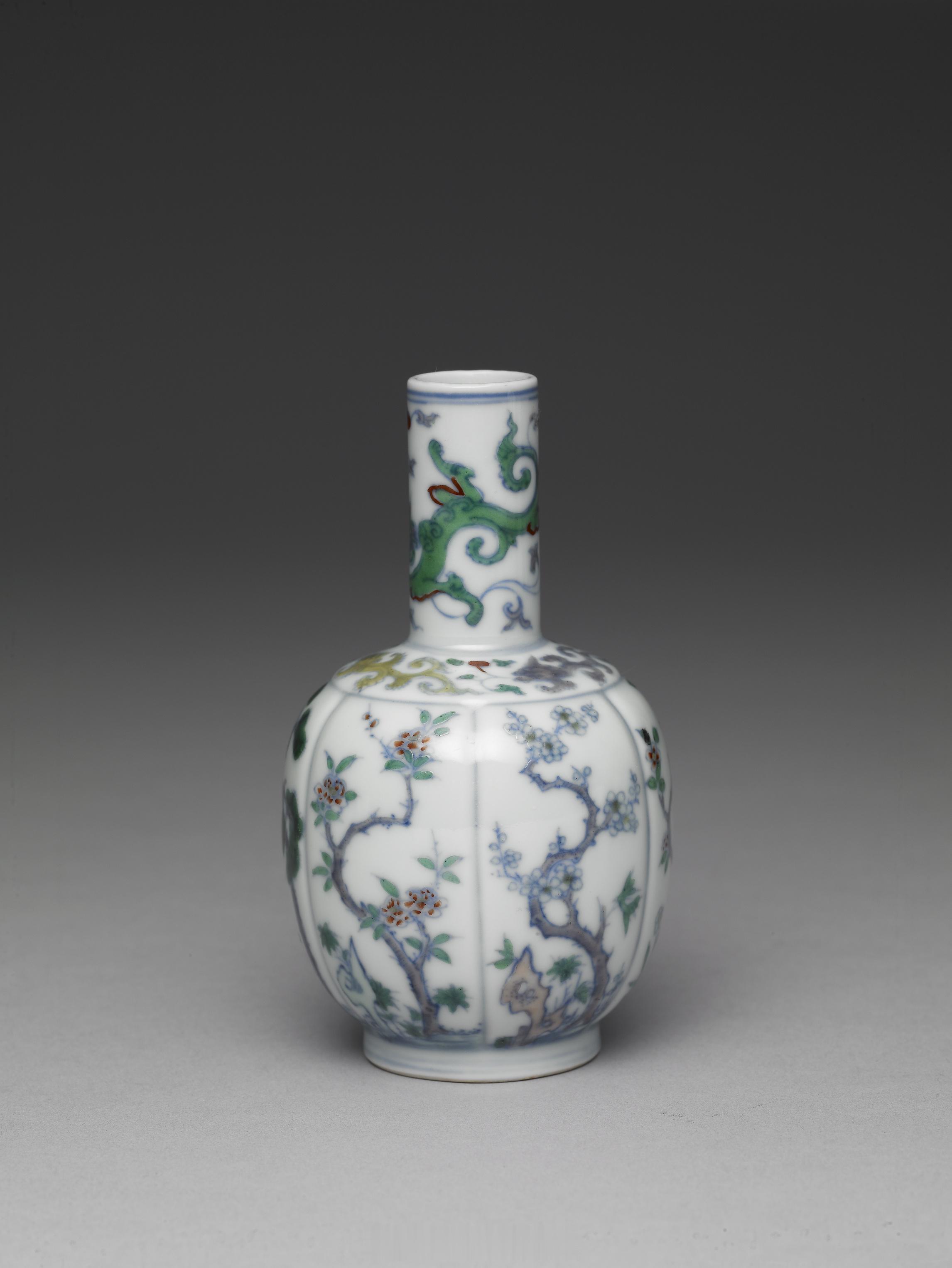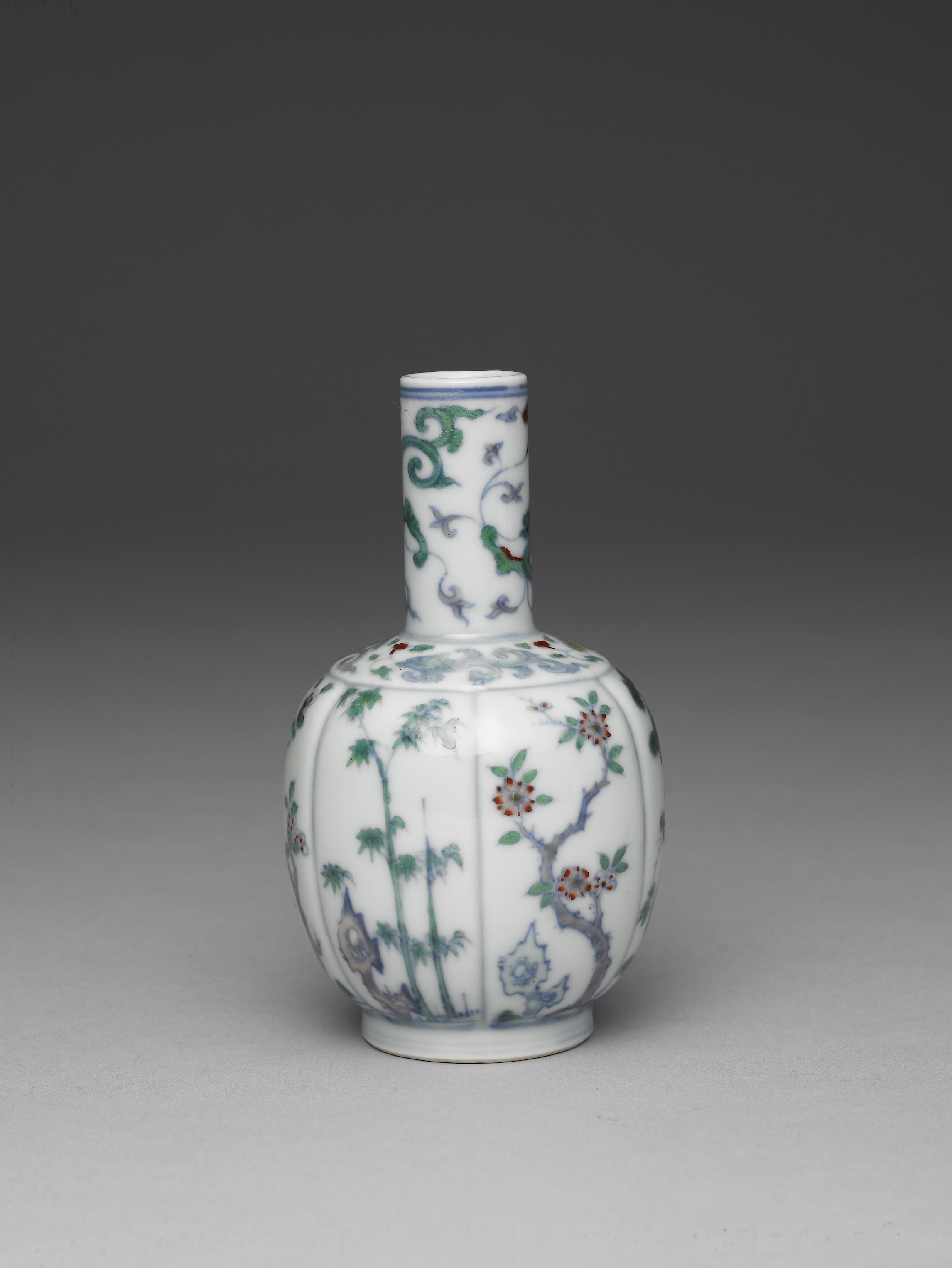 筒状长颈,腹作六瓣瓜棱形,平底,矮圈足。颈、肩饰夔纹衔灵芝。腹六瓣各画松、竹、梅及其他花卉,间饰湖石、小草。底青花书「大清雍正年製」六字楷款,外加双圈。