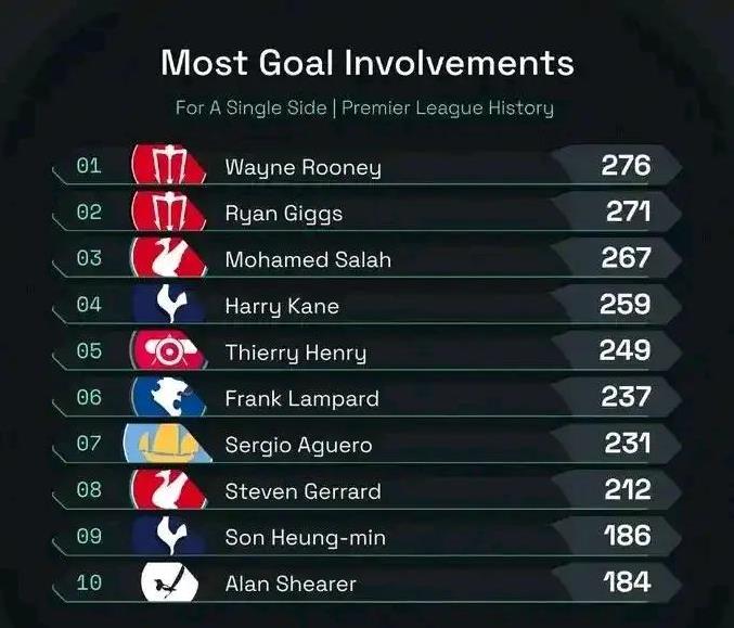 英超历史为一家球队进球榜,萨拉赫有望超鲁尼! 鲁尼为曼联打进276球最多。 吉格斯271球第二多。 萨拉赫目前267球,本赛季有望排第一。