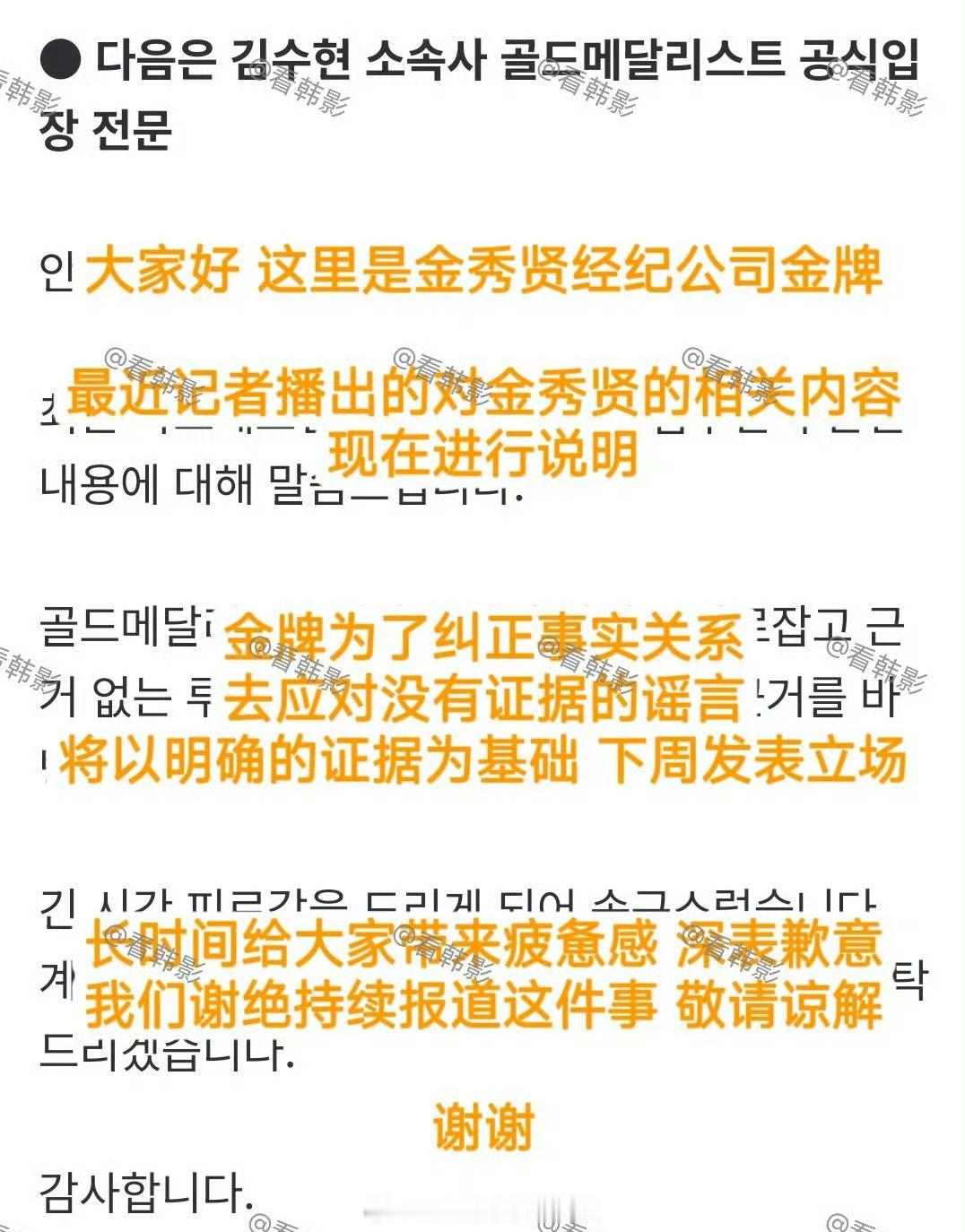 金秀贤将亲自回应争议,其经纪公司称近期相关内容是没有证据的谣言,下周将以明确的证据为基础发表立场。
