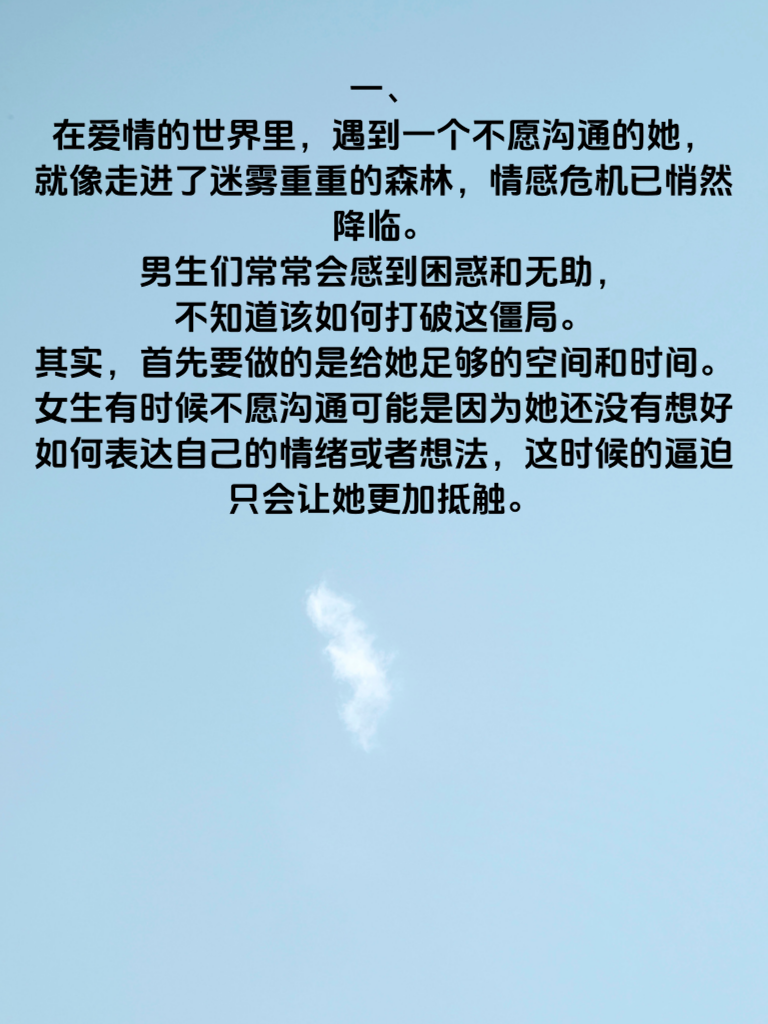 一、在爱情的世界里,遇到一个不愿沟通的她,就像走进了迷雾重重的森林,情感危机已悄然降临。男生们常常会感到困惑和无助,不知道该如何打破这僵局。其实,首先要做的是给她足够的空间和时间。女生有时候不愿沟通可能是因为她还没有想好如何表达自己的情绪或者想法,这时候的逼迫只会让她更加抵触。 二、然后,男生可以尝试用一些小举动来表达自己的关心。比如为她准备一份她最爱吃的小点心,附上一张温馨的小纸条,简单地写上‘希望你今天开心’。这种无声的关怀往往能够在不经意间触动她的心弦,慢慢软化她的态度。 三、当她开始有一些回应的时候,男生要学会倾听。不要急于表达自己的观点,而是让她把内心的想法都倾诉出来。在这个过程中,用眼神和点头给予回应,让她感受到你是真的在乎她的感受。 四、最后,要共同寻找解决问题的方法。可以一起回忆曾经美好的时光,唤起那些积极的情感,然后再一起探讨如何避免类似的矛盾再次发生,重新建立起健康的情感关系。