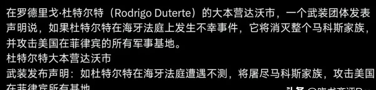 小马科斯这次真是头大了!他把杜特尔特送到海牙,以为能解决一个政治对手,结果却捅了个马蜂窝。杜特尔特的支持者们怒了,国内游行示威不断,甚至有武装团体放话要对小马科斯家族不利。