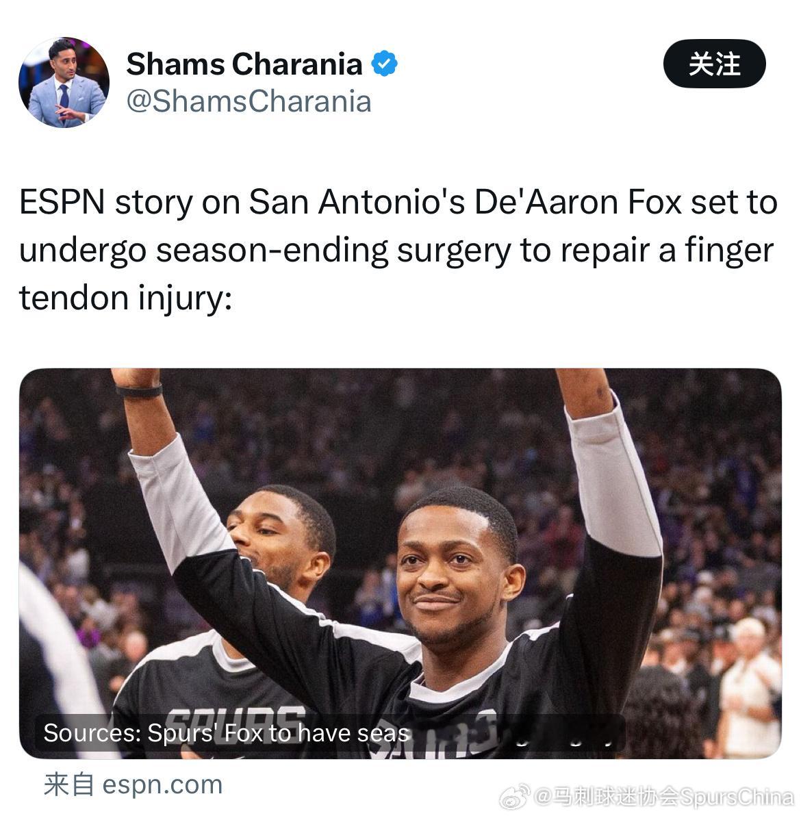 福克斯在去年10月的训练营期间遭遇这一伤病,并带伤征战整个赛季。对于马刺和福克斯而言,现在选择手术的决定是为了加快康复进程,并在休赛期与球队阵容建立化学反应。