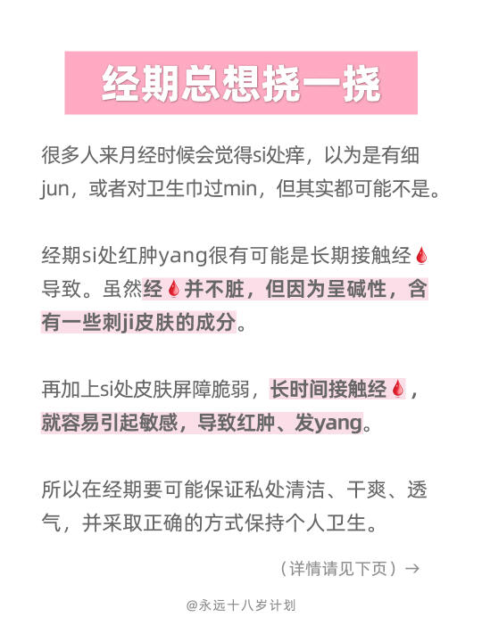 如果经期经常觉得si处痒痒的话,不如试试勤换卫生巾,减少si处跟经血接触的时间~