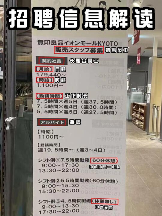 近期很多同学问日本打工薪资情况,今天以 大阪无印良品 的招聘信息为例,科普常见术语+时薪参考,给计划赴日的同学们做功课用👇