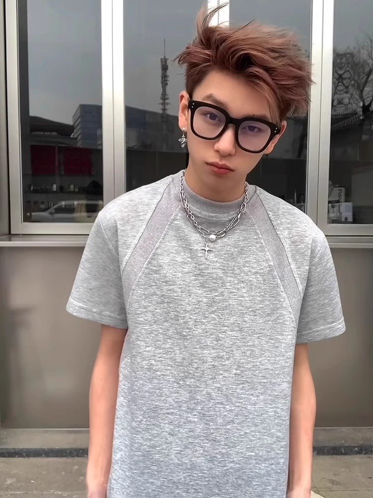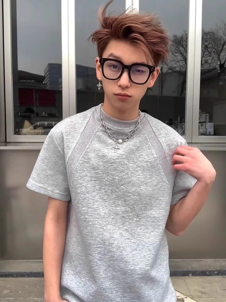 白色金属标小v领短袖男夏季显肩宽空气层半