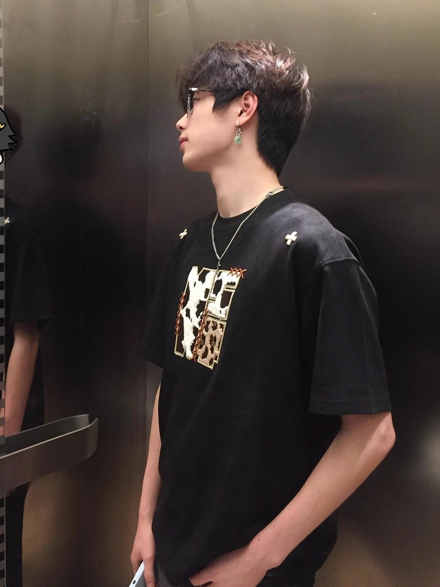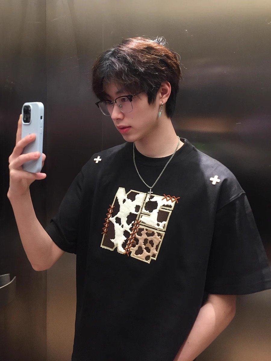 奶牛纹贴布刺绣t恤男夏季设计感小领口正肩