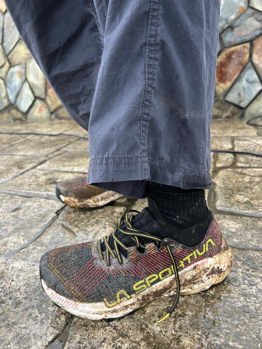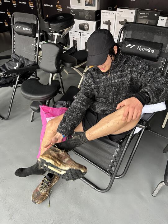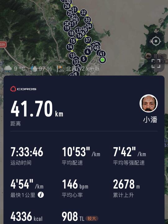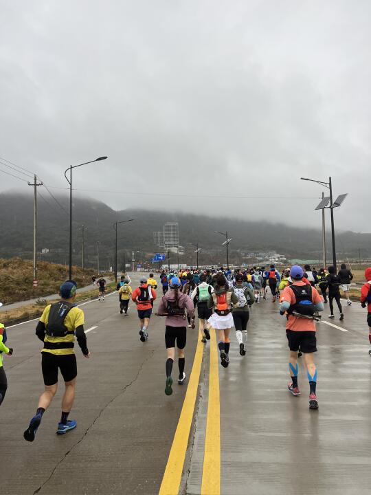没想到我这月跑量100的跑渣也能进前一百! 今天舟山的天气实在有点太恶劣了,下坡滑得几乎没法跑,上坡更是陡得跑不动,鞋底粘的泥可能有3cm厚 建议越野东海可以改名东海十攀,几乎一直在上下坡… 明天25公里的朋友们加油,天气冷,注意保暖