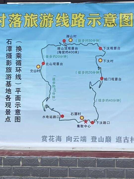 石潭村旅游集散中心(石潭村委会)→城门观景台→下汰村→下汰村观景台→湖山村→湖山顶观景台→北山观景台→北山村→水电站→石潭村
