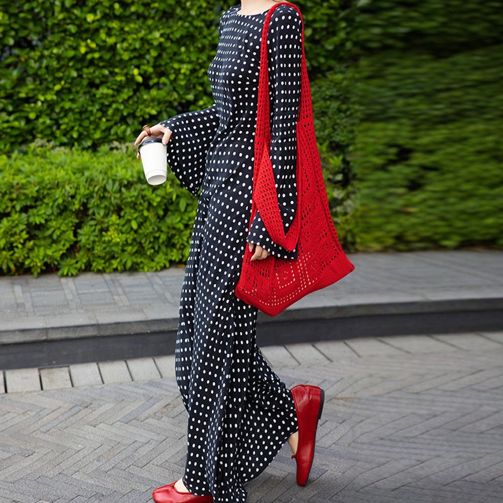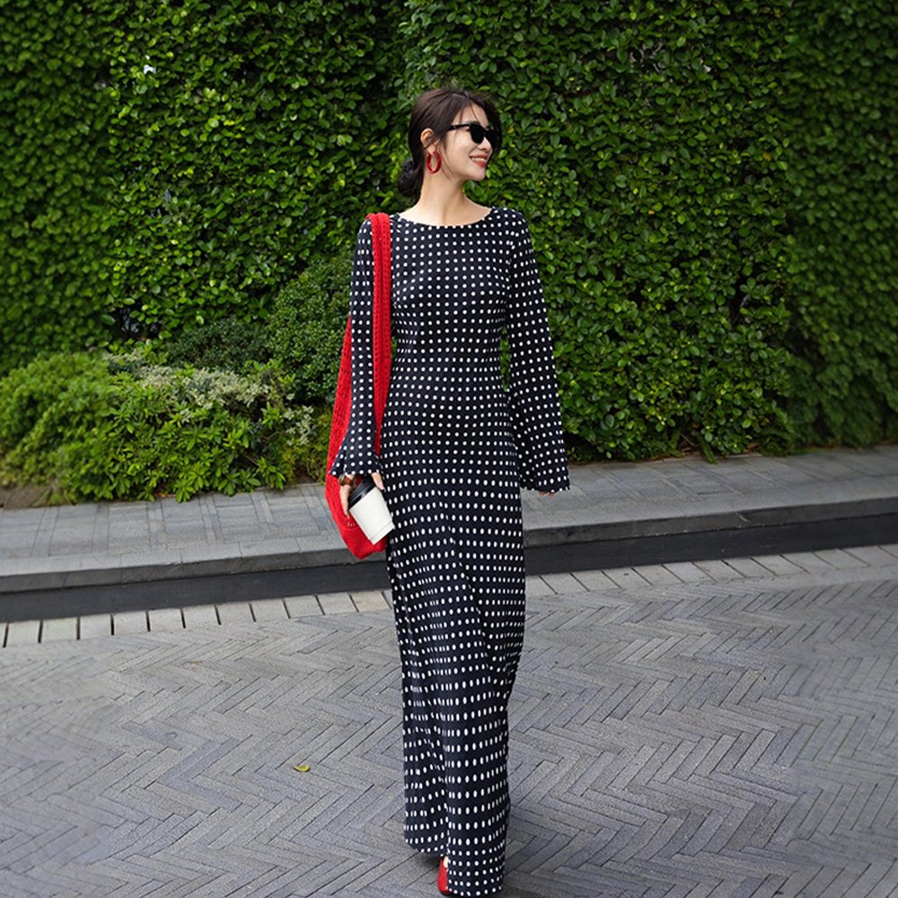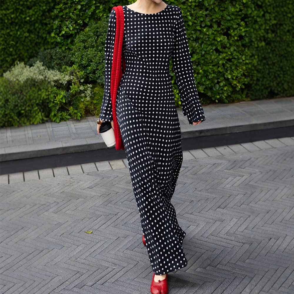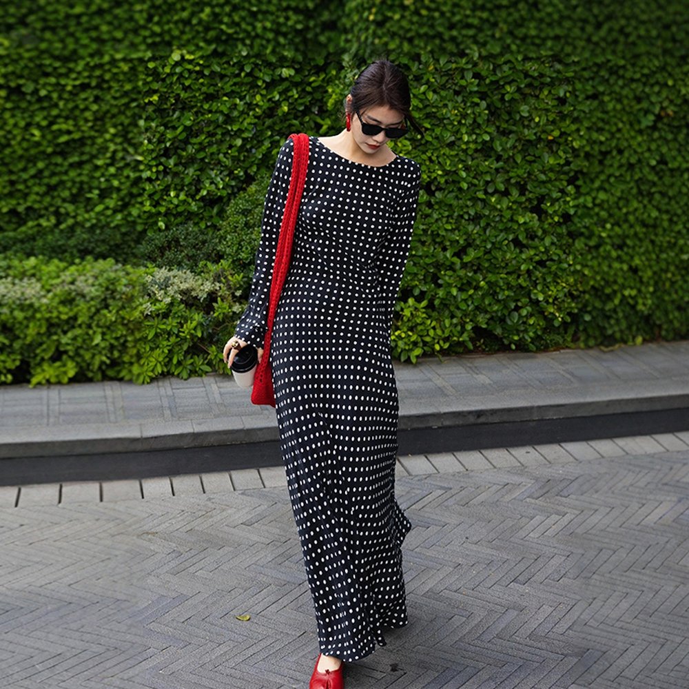 超好看韩系收腰波点连衣裙茶歇法式气质长裙