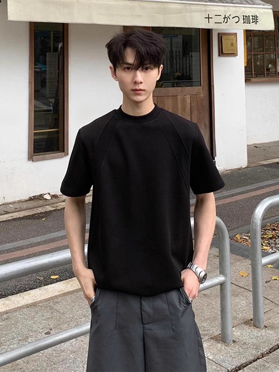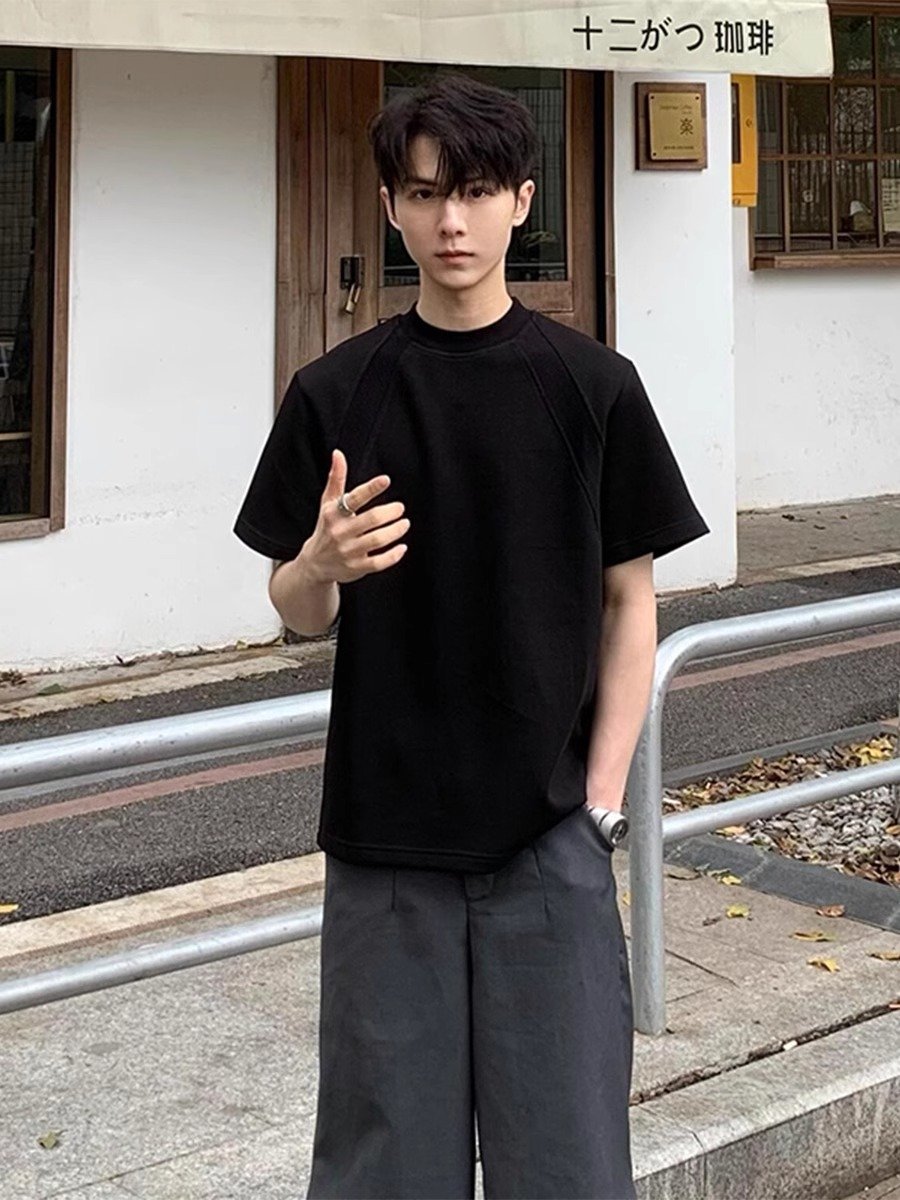 黑色boxy正肩短袖男夏季空气层拼接纯棉