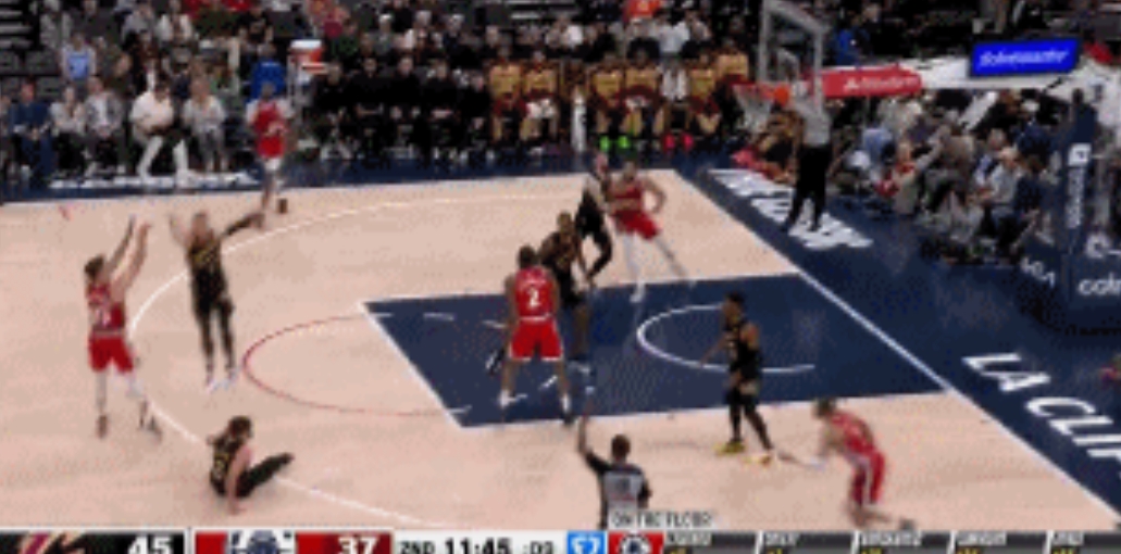 图一:在骑士对阵快船的第一节比赛最后时刻,米切尔持球过半场后直塞右侧底角的亨特,虽然哈登扑了过去,但是亨特顶着人依然压哨命中