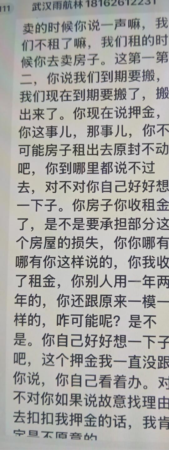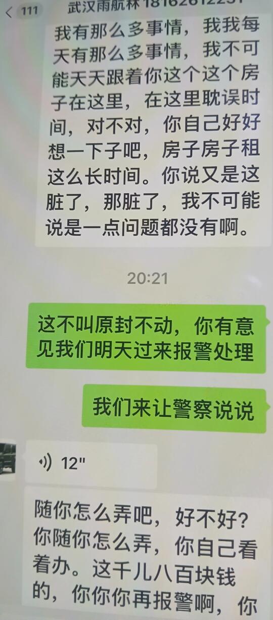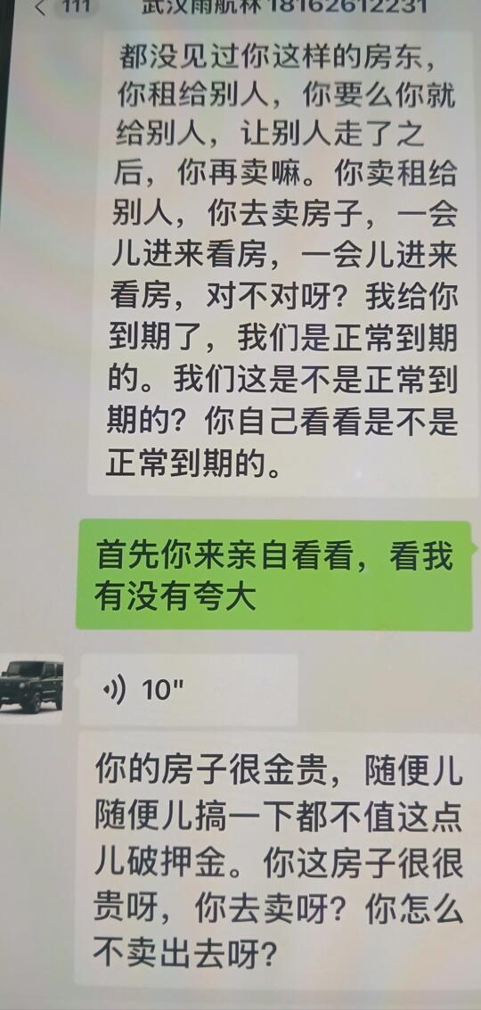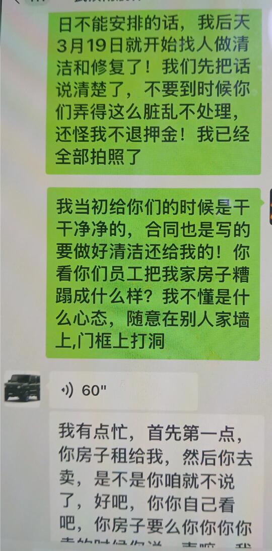 我回国后他们说洗菜盆脱落了,我马上第二天就带工具和玻璃胶过来处理了!之后我想卖房,让中介进来拍照,老板各种抱怨打扰他们,说房子降价了教育我不要卖[鄙视R]后来有客户想上门看,他们不乐意不配合就算了,只能想着收房了再说!确实租客该发牢骚没啥好说的,但是拿我卖不掉房说事就搞笑了!关他啥事[扯脸H]然后前几天交涉就不愉快,提醒他们3月17到期,老板总说忙,没空搭理我,后来回我家人说早一点,晚一点都不要紧,小事情,清明节之前肯定搬出来!被我严词拒绝了,之后交涉交房时间就不搭理我了直接说忙,不会拖我,直接挂电话了!