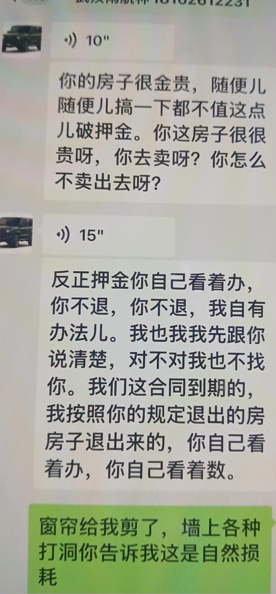 我家柜子,桌子,床,坏了也就算了,我买的出租品质,不用对方开口,我都当自然损耗,门套有点破了也就算了我还可以收房再修复!但是租客自己在门套,墙上各种打洞[石化R]窗帘给我剪短,卫生间,木地板,厨房,抽油烟机这么脏还不清洁,给他们之前是干干净净,合同也写了交接要做清洁,昨天一直不回话,今天一听到扣押金不懂哪来的理直气壮开始耍泼!这些都不够1500修的[失望R]