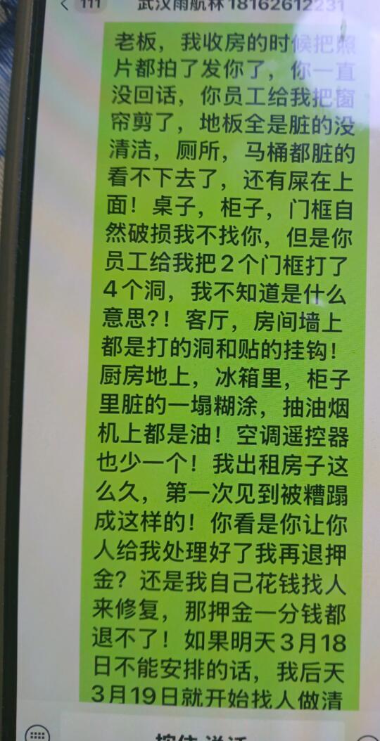 17号去收房,直接傻眼,这就是他嘴里的做完清洁了!然后我家人把各种照片拍给他,他装死不回话,等了一天今天告诉他要么清洁干净,做好修复才退押金,再不回话,我们自己找人清洁修复,肯定不退押金的,1500都不够修复!开始耍泼威胁了[石化R]