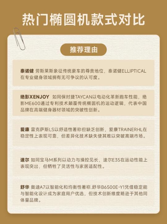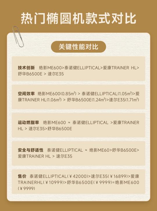 技术创新:绝影ME600 > 泰诺健Elliptical > 爱康Trainer HL > 舒华B6500E > 速尔E35