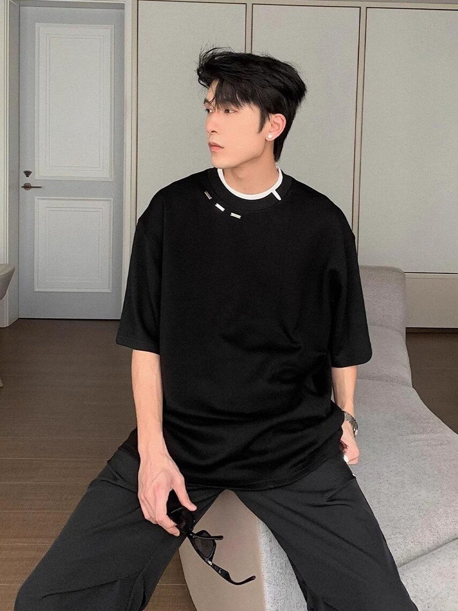 黑色假两件短袖t恤男款夏季高级感宽松半袖