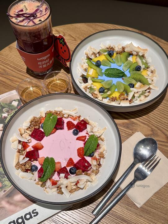 端上来那一刻我真的舍不得下口! 是好吃又好看的酸奶碗!!! 酸奶是那种偏浓稠的质地,而且是无糖的 混合谷物脆增加口感层次,水果吃起来就很新鲜!特别是蓝莓好甜呀! 还可以按自己的喜好加点搭配的蜂蜜 酸奶质地丝滑醇厚!一份下来饱腹感满满的!好适合当管理器的晚餐!都给我冲!