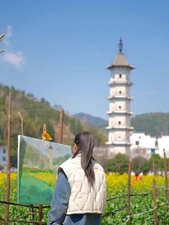 2️⃣塔下还有溪流,也可以到河的另一边,油菜花连河和塔一起拍下来,超有油画🖼️般的感觉;