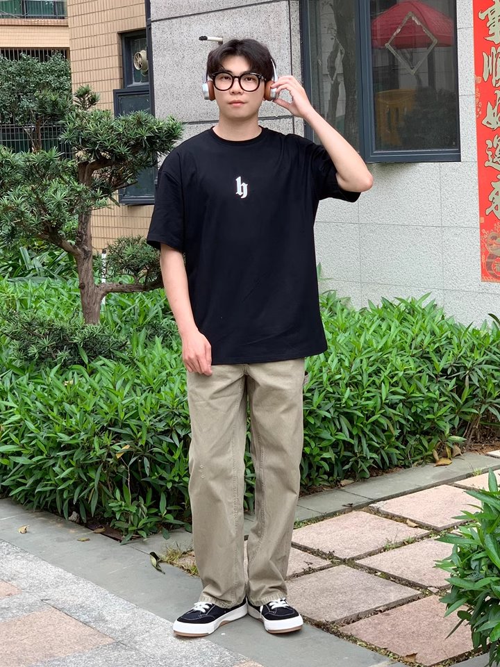 黑色短袖T恤搭配卡其色裤子,深配浅太显瘦啦,纯棉立体印花短袖更是质感十足