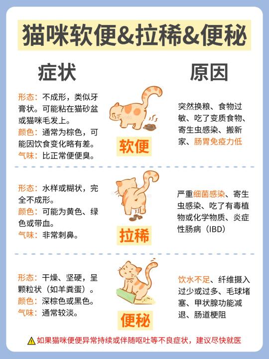 猫咪软便、拉稀和便秘都是猫咪常见的异常便便,铲屎官不用太焦虑,但异常持续或伴随呕吐等症状,建议尽快就医。