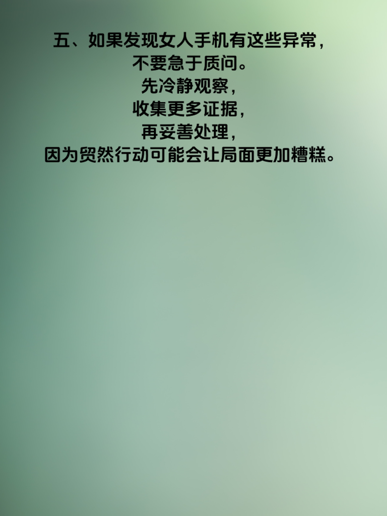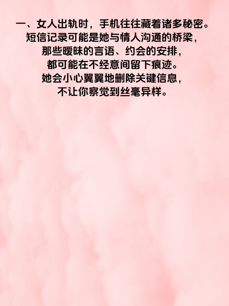 一、女人出轨时,手机往往藏着诸多秘密。短信记录可能是她与情人沟通的桥梁,那些暧昧的言语、约会的安排,都可能在不经意间留下痕迹。她会小心翼翼地删除关键信息,不让你察觉到丝毫异样。 二、通话记录也是重点关注对象。她或许会频繁与某个特定号码联系,通话时间较长且避开你的视线。甚至在你靠近时,会紧张地收起手机,生怕被你发现端倪。 三、社交软件更是暗藏玄机。她可能在上面与情人互动频繁,分享生活点滴,互诉衷肠。朋友圈的动态也许经过精心筛选,只展示那些不会引起怀疑的内容,却不知有些蛛丝马迹早已暴露。 四、相册里说不定也有秘密。有与情人的合照,或是记录出轨瞬间的照片,她会想尽办法隐藏,比如设置加密相册,以为这样就能瞒天过海,却不知再小心也可能被你察觉。 五、如果发现女人手机有这些异常,不要急于质问。先冷静观察,收集更多证据,再妥善处理,因为贸然行动可能会让局面更加糟糕。
