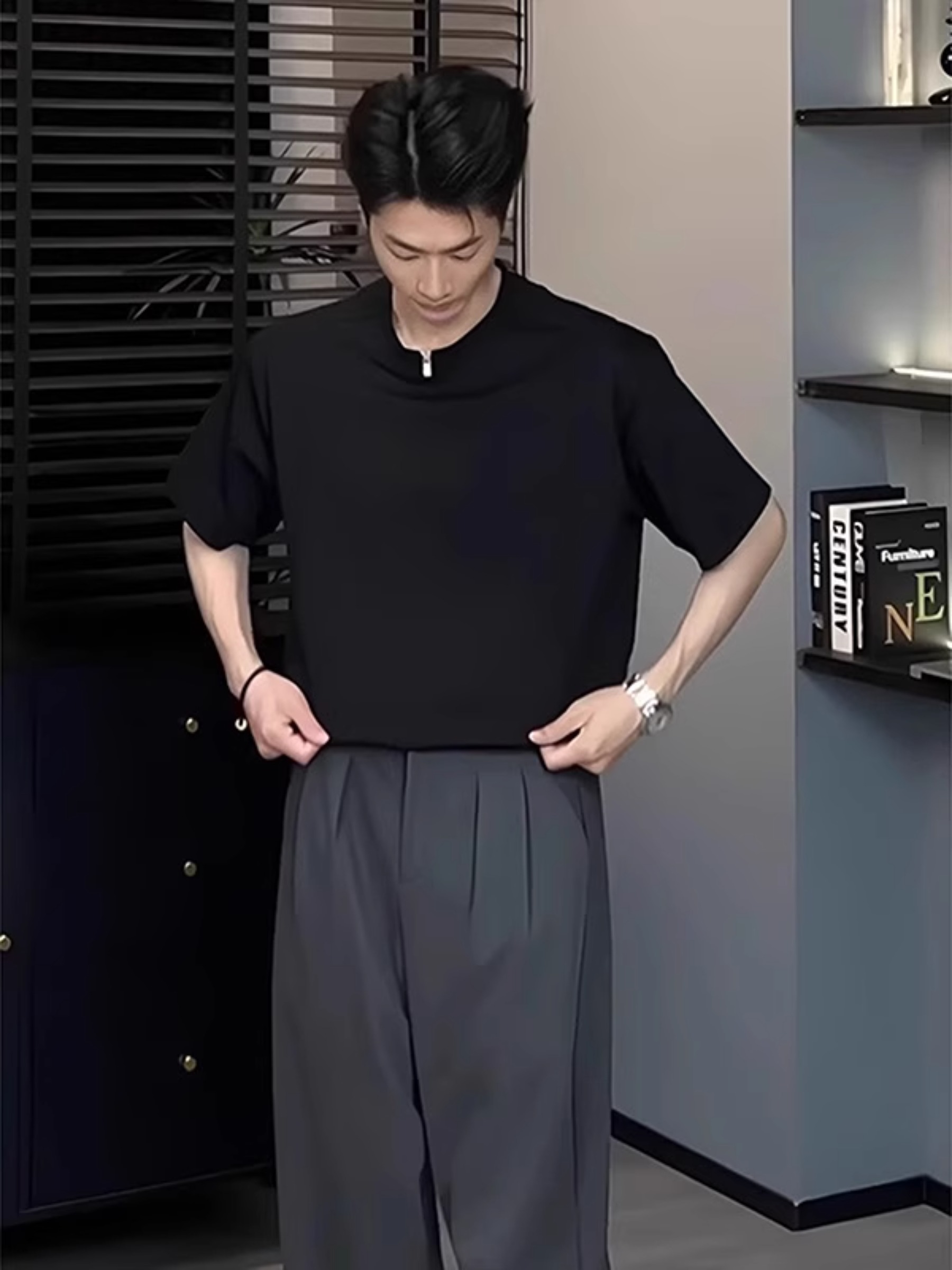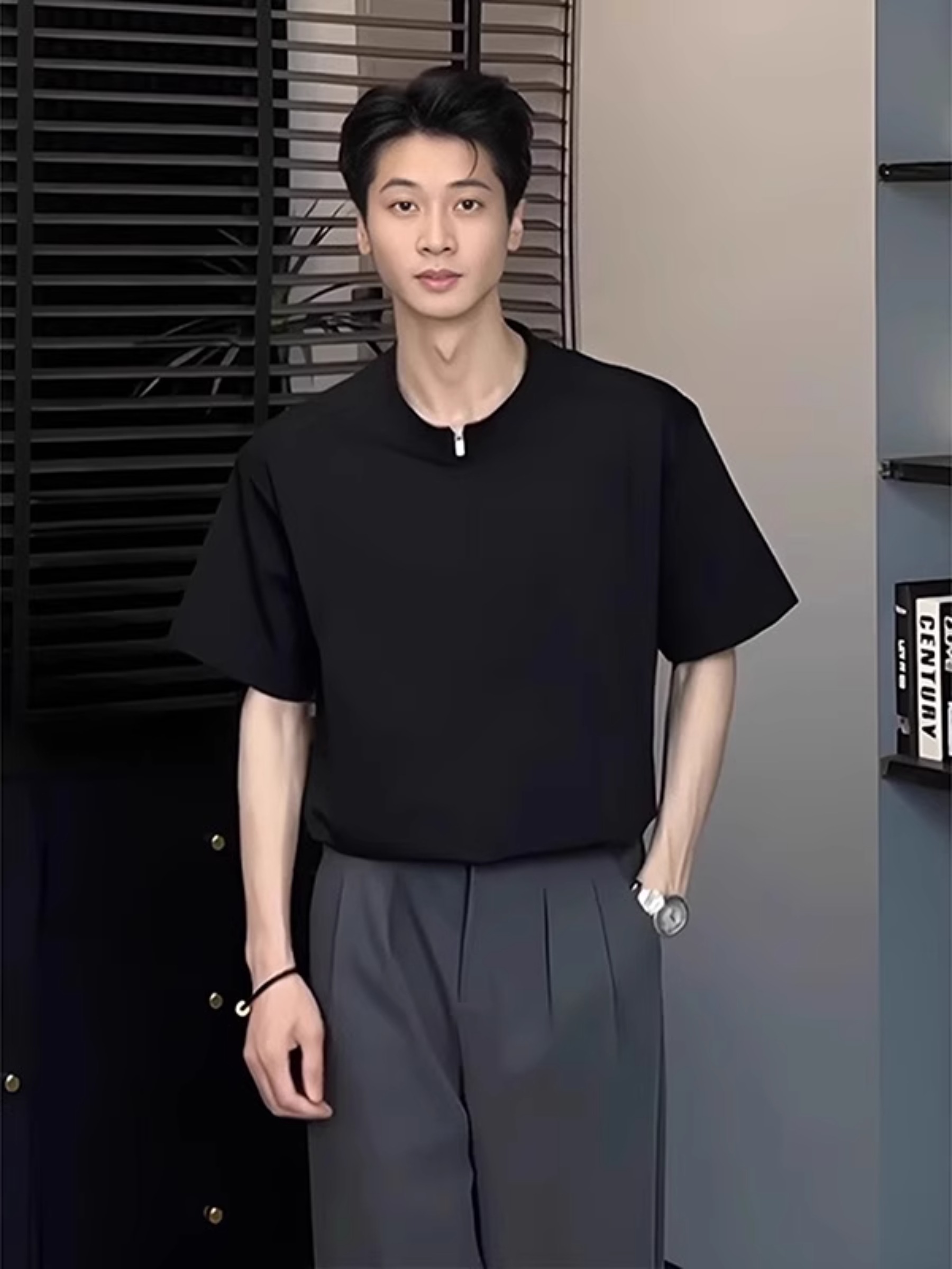 黑色金属扣纯棉短袖t恤男夏季解构设计感c