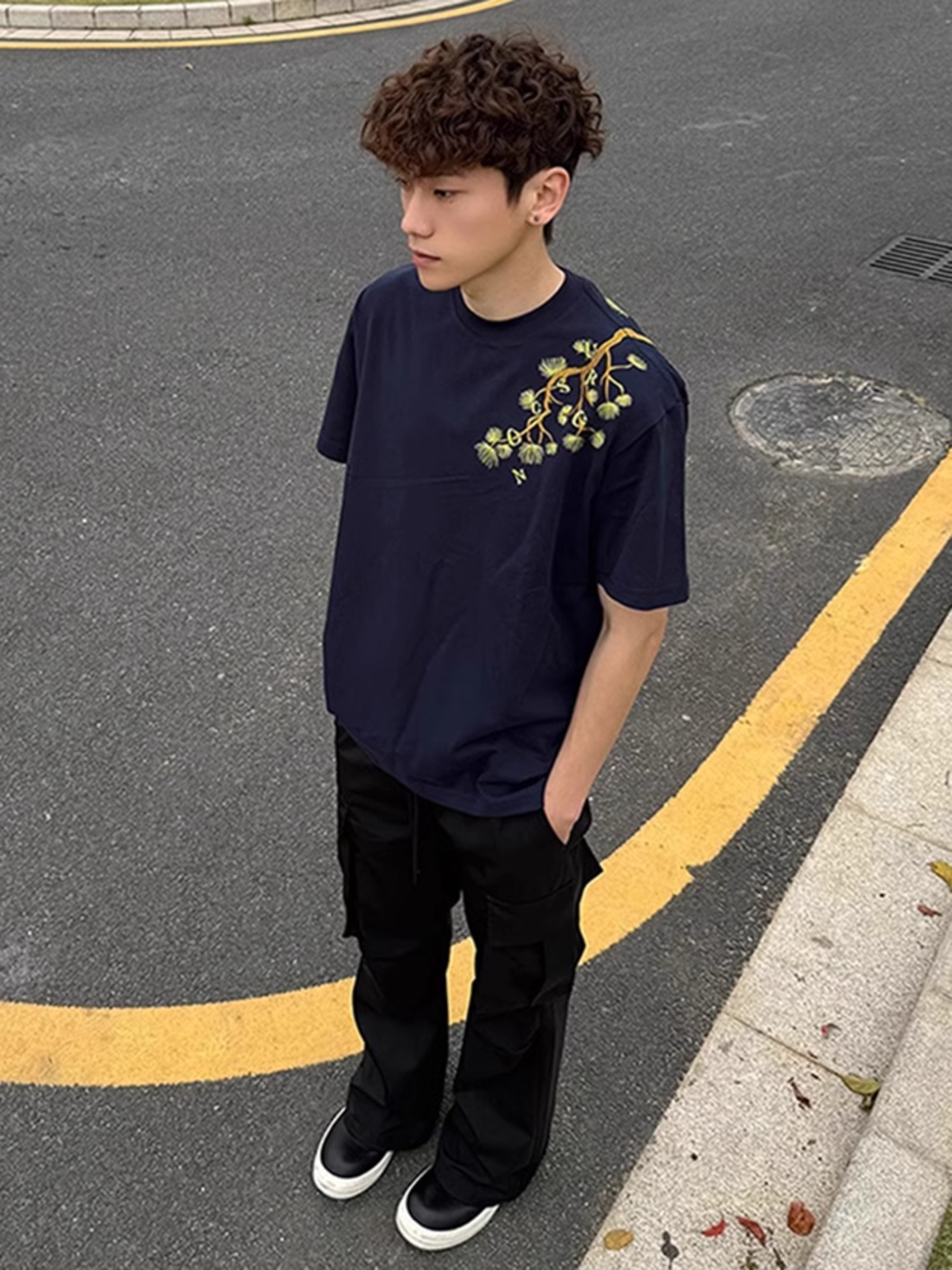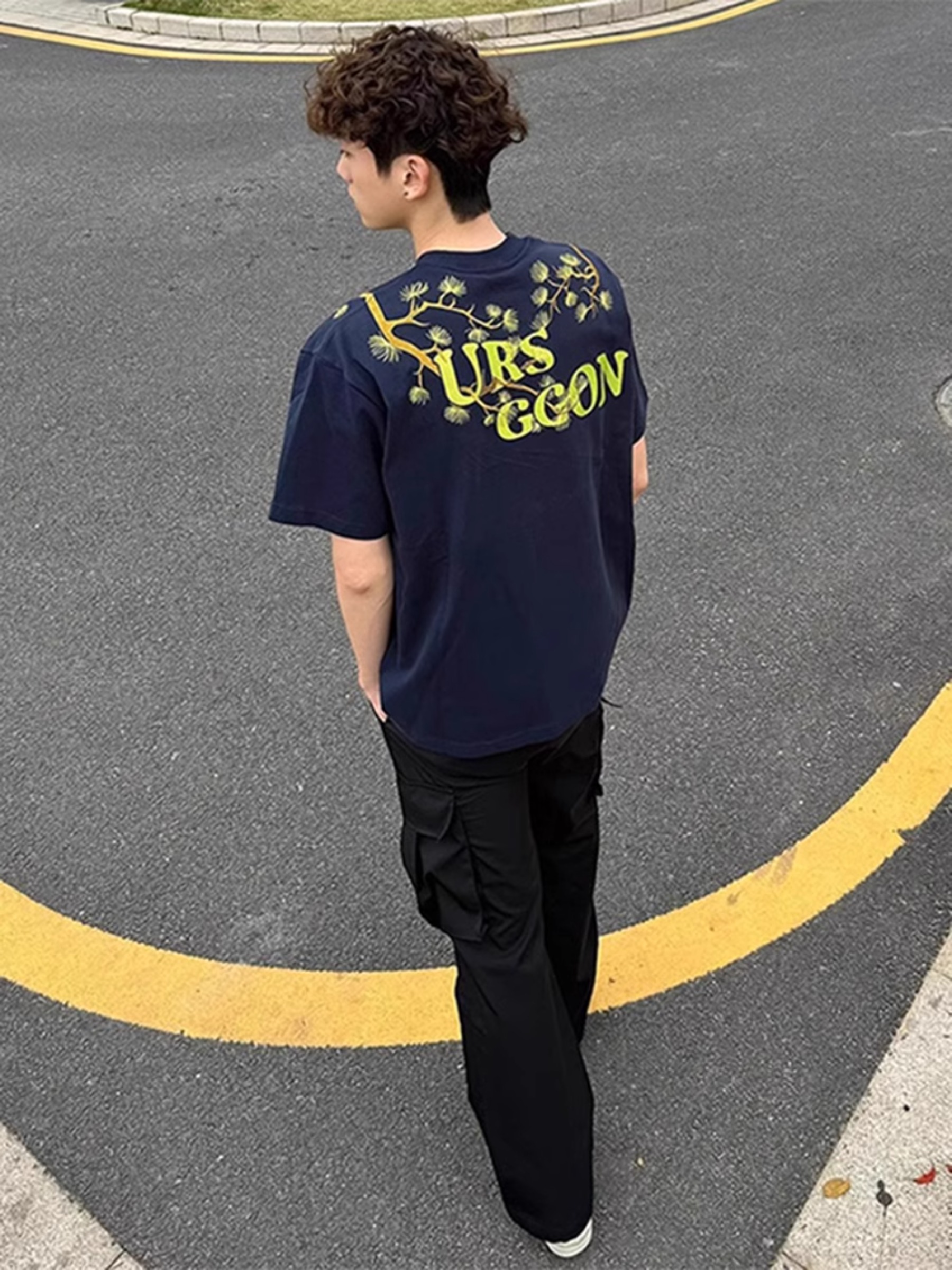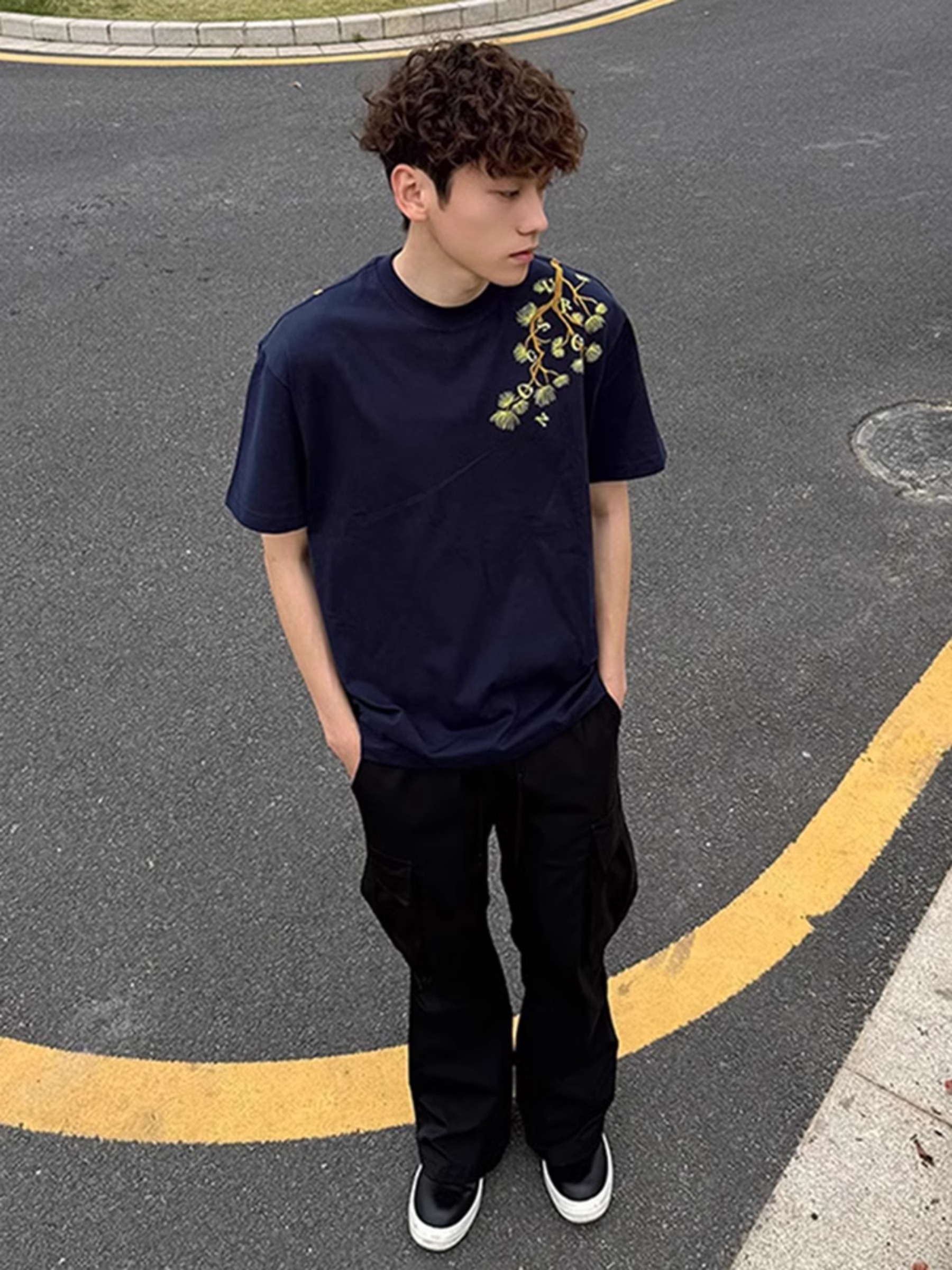 藏青色罗汉松刺绣短袖男款夏季青少年帅气t