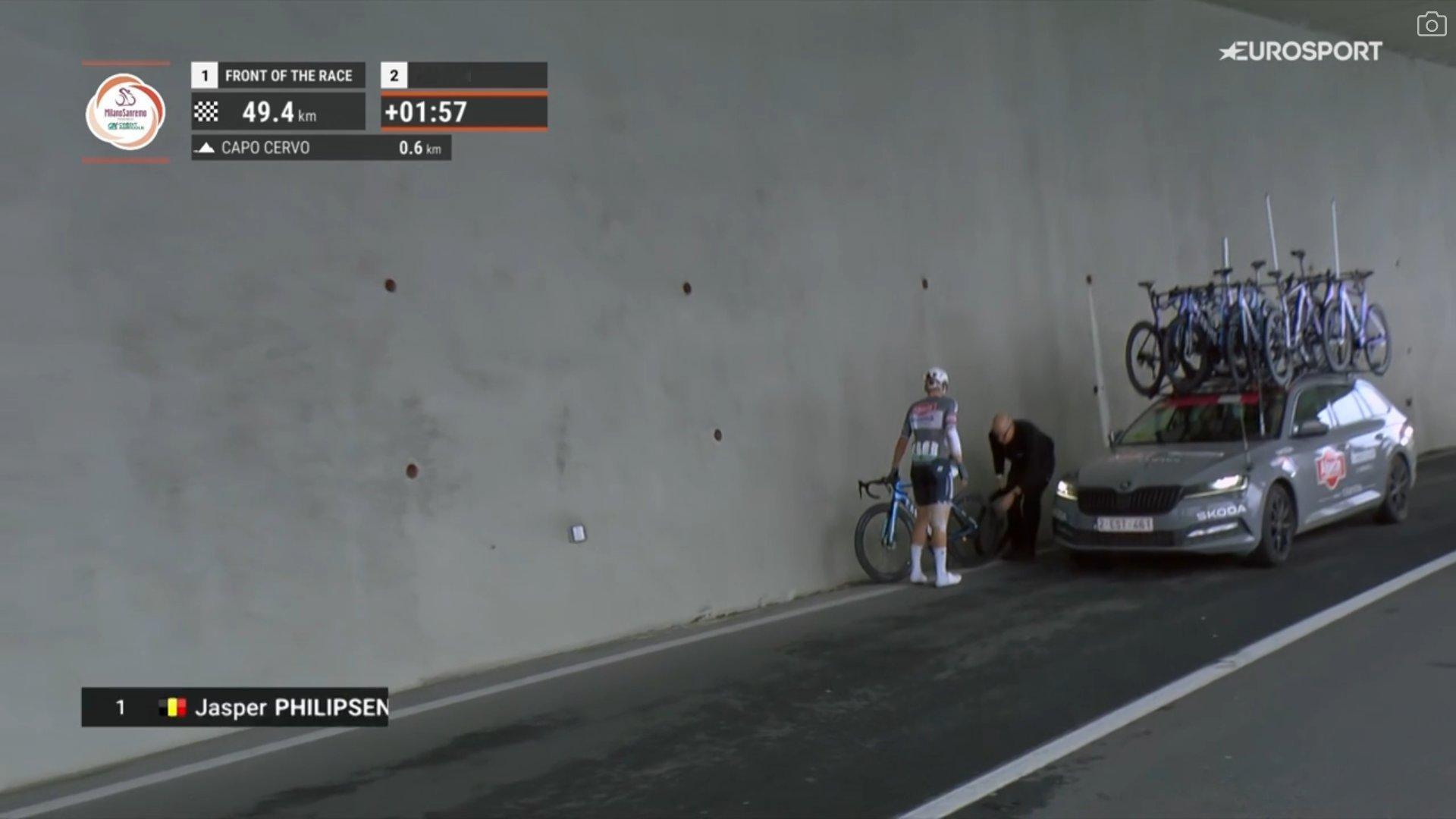 米兰圣雷莫阿联酋航空车队开始提速,皮西等人卷入摔车,菲利普森爆胎…