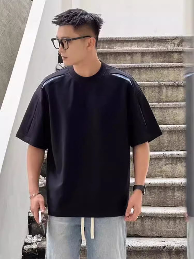 白色小领口垫肩短袖男女夏季美式高街重磅硬