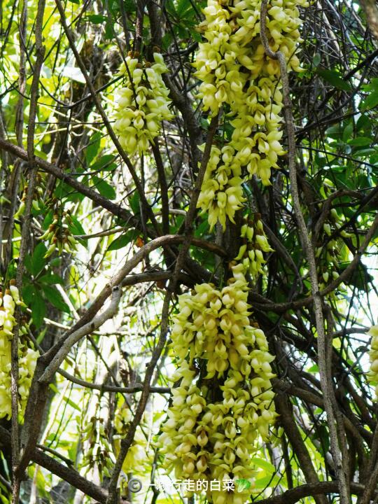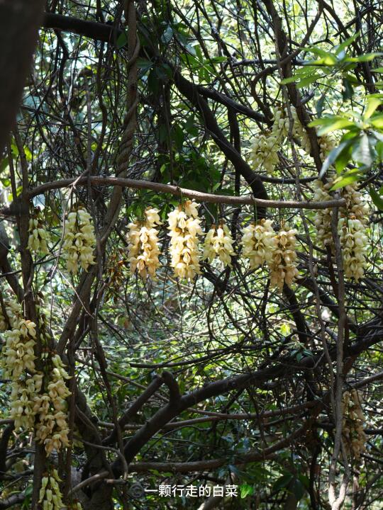 今天在后山邂逅了一位藤届仙女——白花油麻藤,它是豆科家族里会开月光瀑布的魔法师,花开时节动山林,数十朵奶白色铃铛花串成银河,垂坠的流苏裙摆缀满晨露,像被揉碎的月光落进藤蔓里。远远望去,仿佛山林里出现了月光瀑布,如梦如幻。