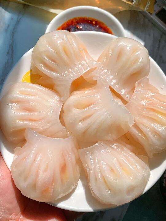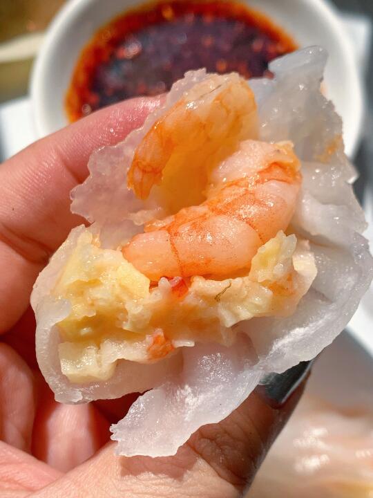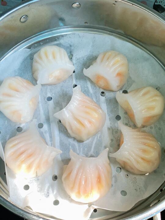 比早茶吃的虾饺皇还绝! 开袋无需解冻,水开后上锅蒸8-10分钟就行~ 开盖Duang~Duang~晶莹剔透的虾饺太诱人了! 咬开糯叽叽的水晶皮,里面是两只完整的虾仁🦐,还有脆脆的笋丁!鲜呐!! 才吃了一口我妈就让我再多囤几袋!