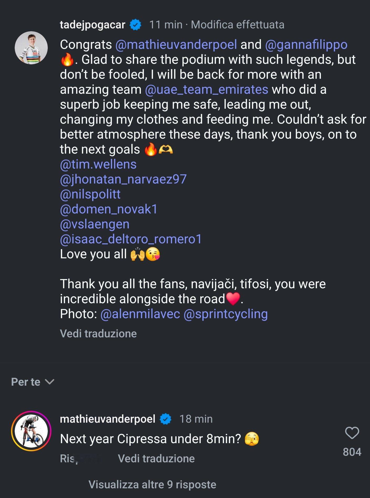 波加查在社媒上祝贺范德普尔夺冠,并说明年还会卷土重来,最后感谢了队友和车迷,范德普尔回复:明年齐普雷萨要不破8分钟?(今年刚刚创造了齐普雷萨山的爬坡记录:8分55秒)