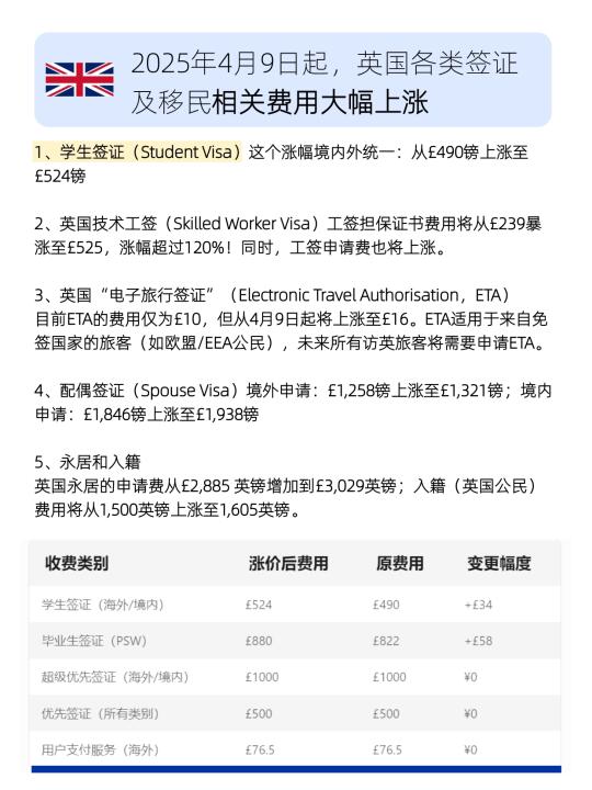 2025年4月9日起,英国将实施新一轮签证费用调整,几乎涵盖所有主要签证类型。学生签证(含陪伴签)费用从【490英镑】涨至【524英镑】,涨幅34英镑,境内境外申请标准一致。其他上涨费用还包括访问签证、工签、永居申请、归化入籍费,此次调整未涉及加急服务费。