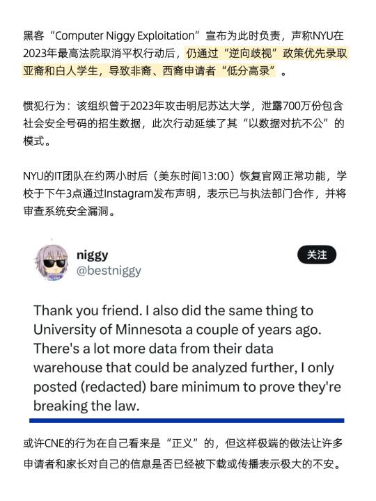 2025年3月22日,纽约大学官网遭黑客组织“Computer Niggy Exploitation”(CNE)攻击,攻击者篡改页面并公开了超过300万份申请者的个人信息及录取数据,包括姓名、SAT/ACT成绩、GPA、种族等敏感信息,数据覆盖1989年以来的每一届申请者。